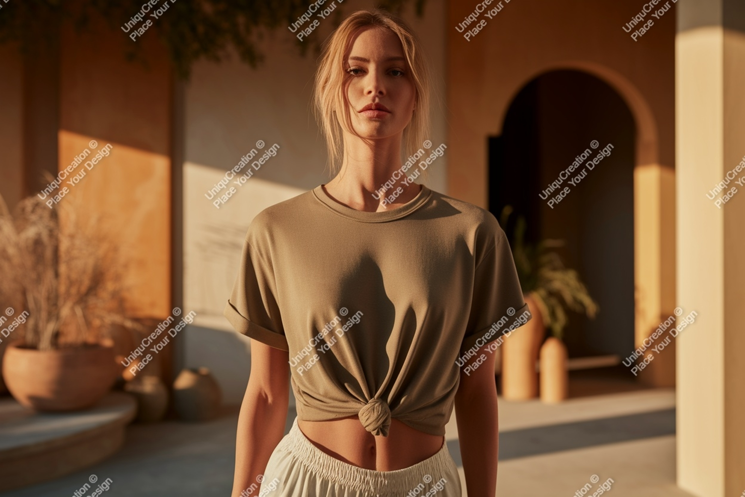 Similar Design Products to Woman wearing olive green t shirt mockup image