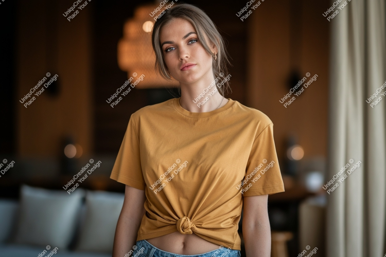 Woman wearing mustard yellow t shirt mockup image example image 1