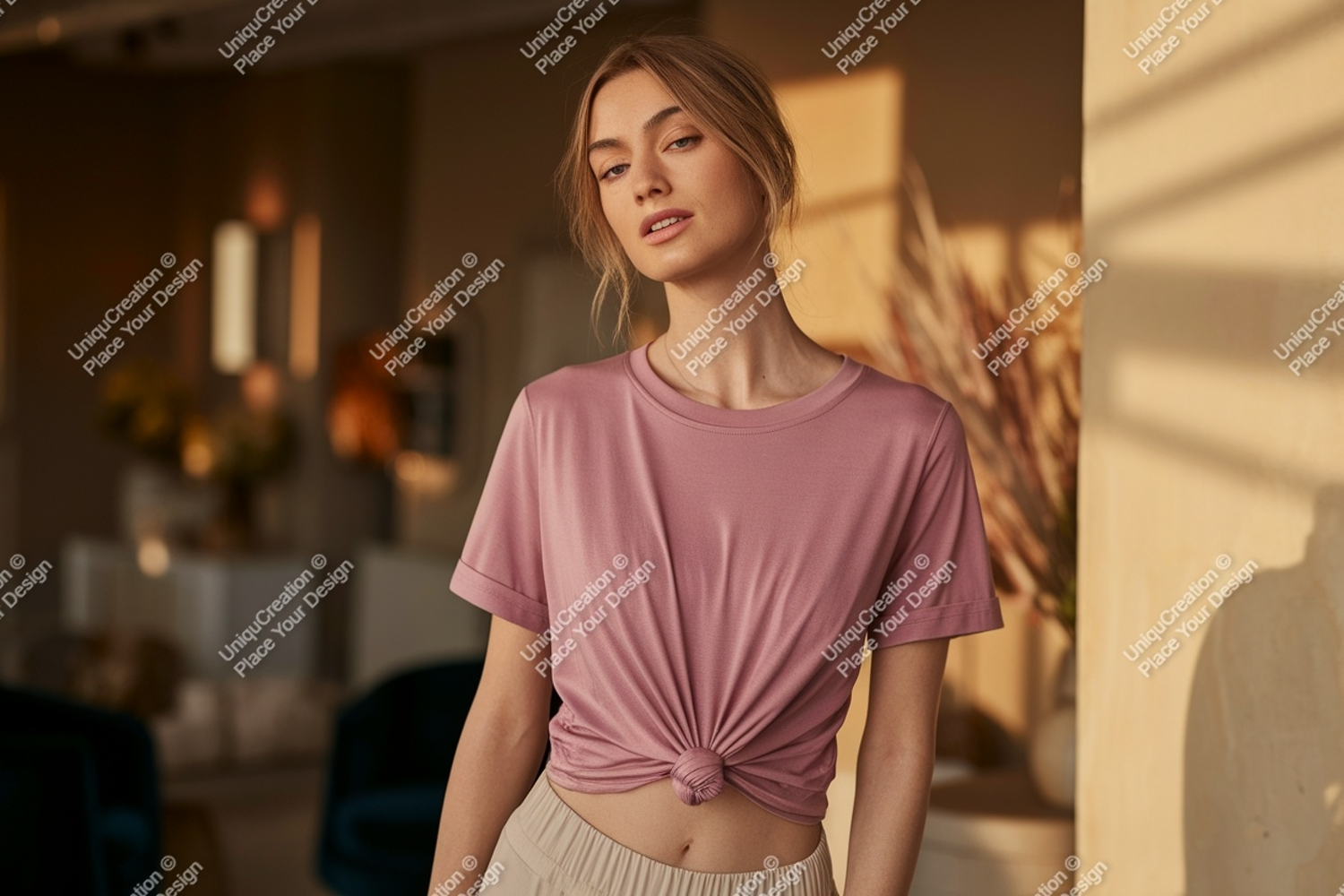 Similar Design Products to Woman wearing pink t shirt and beige pants image