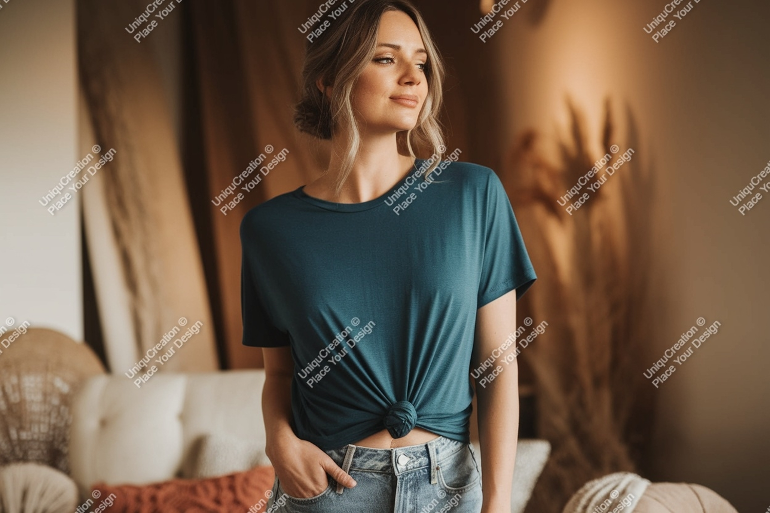 Fashion T-shirt Clothing Casual Mockup Woman Jeans Teal Denim Knot