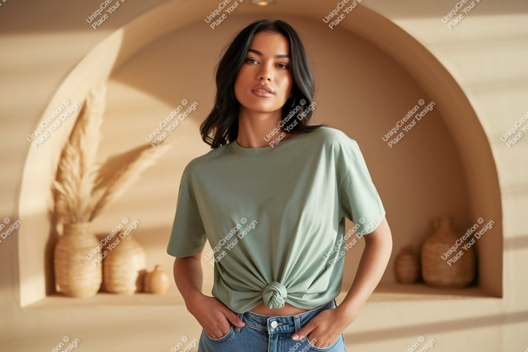 Similar Design Products to Woman wearing sage green t shirt mockup image