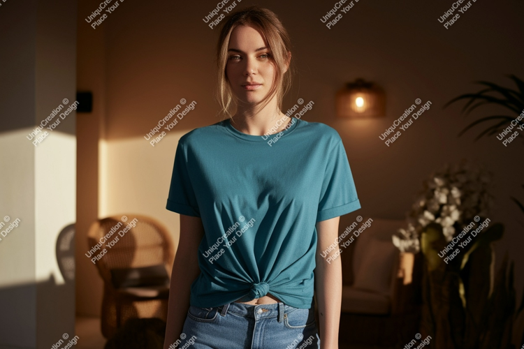 Fashion Shirt Clothing Casual Mockup Woman Jeans Teal T Indoor
