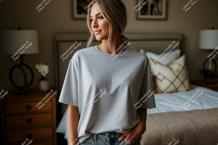 Similar Design Products to Woman wearing grey t-shirt indoors mockup