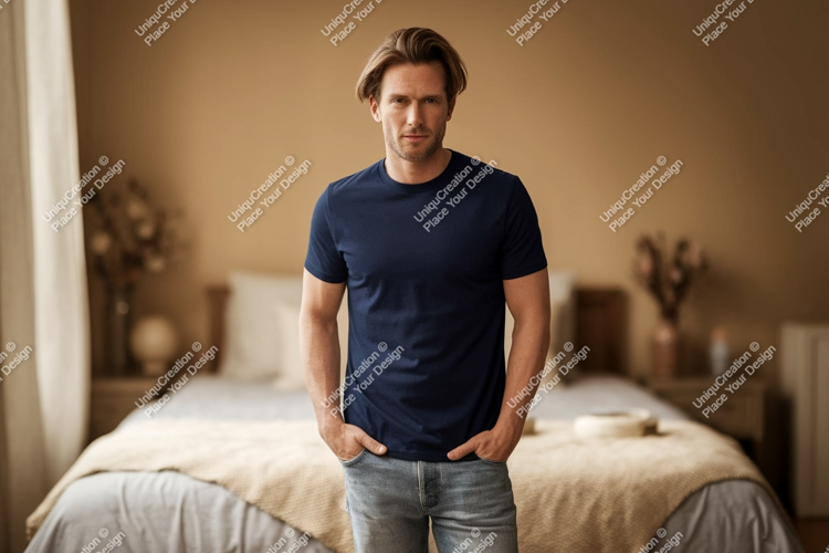 Man Shirt Casual Mockup Blue Jeans Denim T Indoor Bedroom