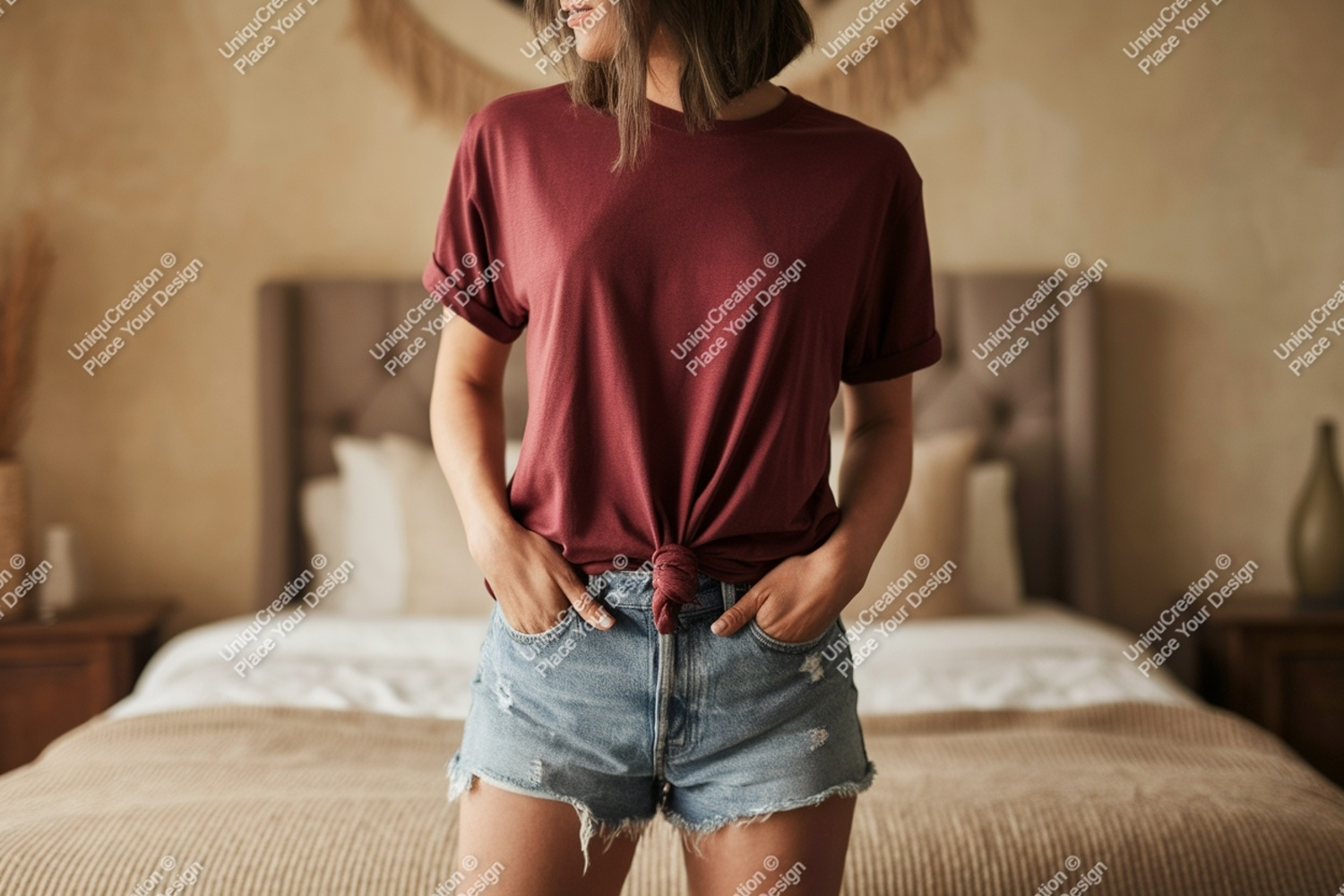 Fashion Style Shirt Casual Mockup Woman Denim Maroon Bedroom Shorts