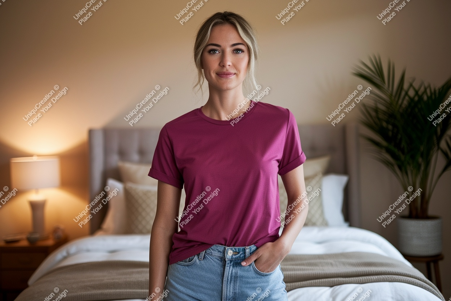 Shirt Mockup Woman Plant Jeans Bed Magenta Lamp T Bedroom