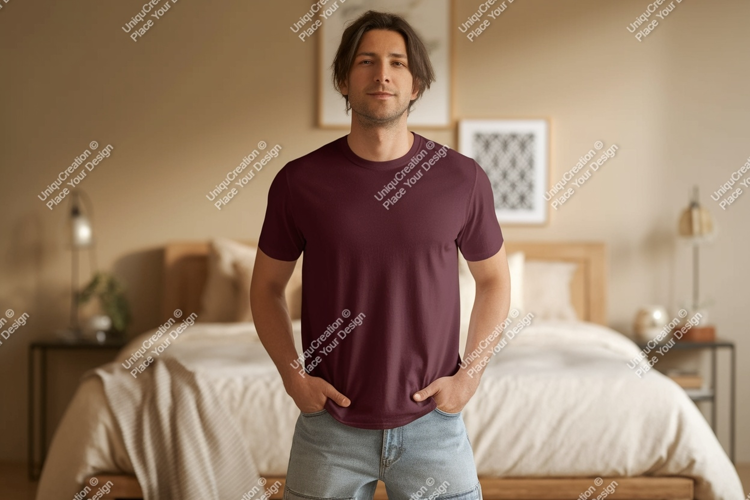 Man Shirt Clothing Casual Mockup Denim T Maroon Bedroom Shorts