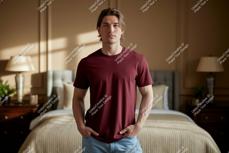 Man Shirt Casual Interior Mockup Blue Jeans T Maroon Bedroom