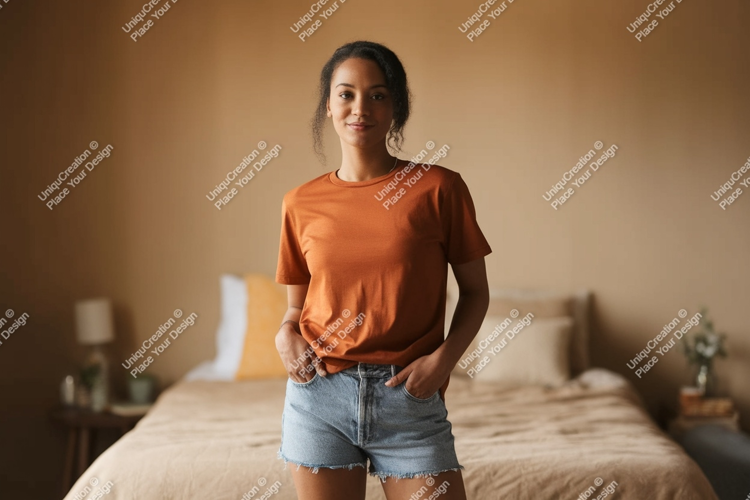 Shirt Casual Interior Mockup Woman Orange Denim T Bedroom Shorts