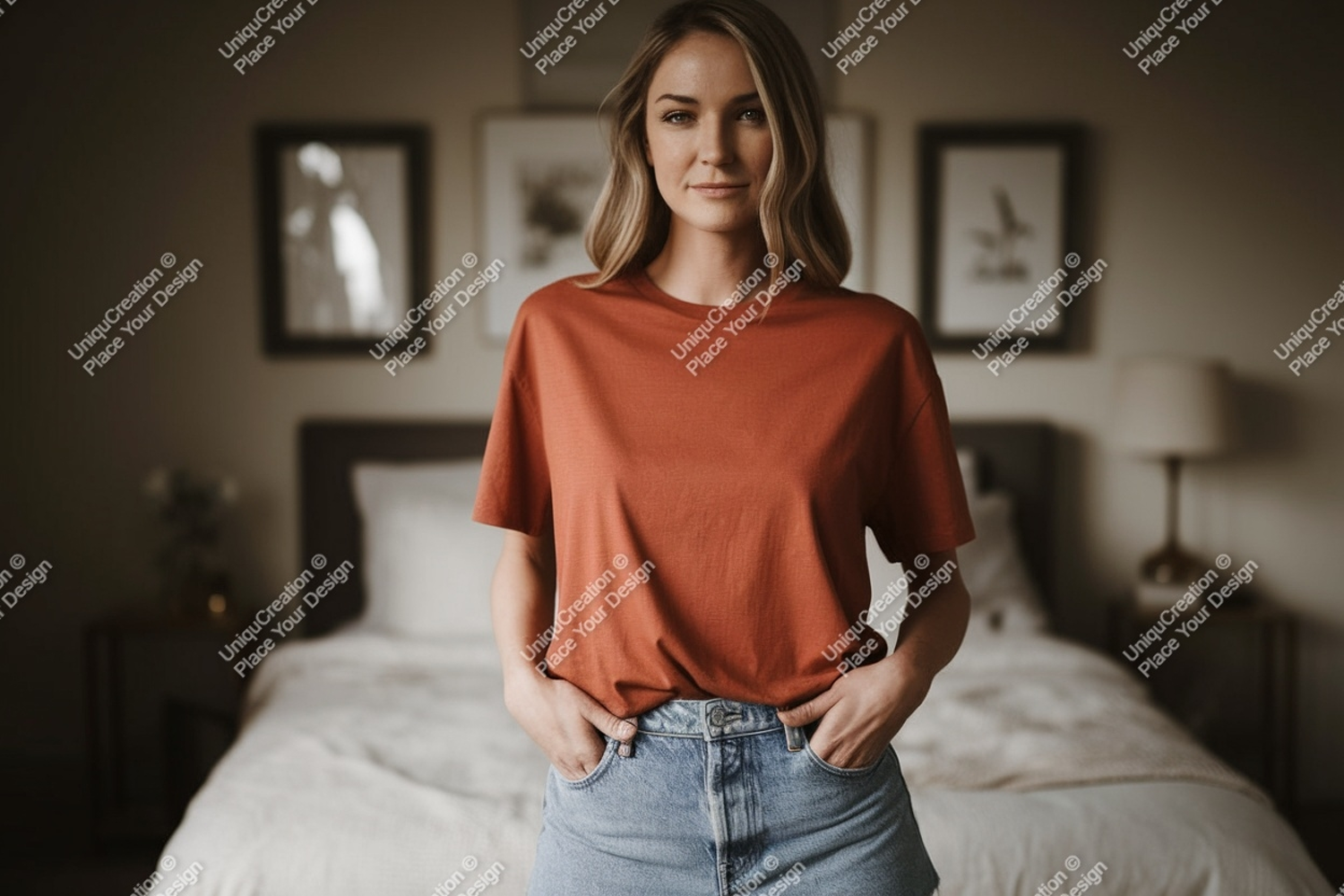 Fashion T-shirt Casual Mockup Woman Denim Indoor Bedroom Shorts Terracotta