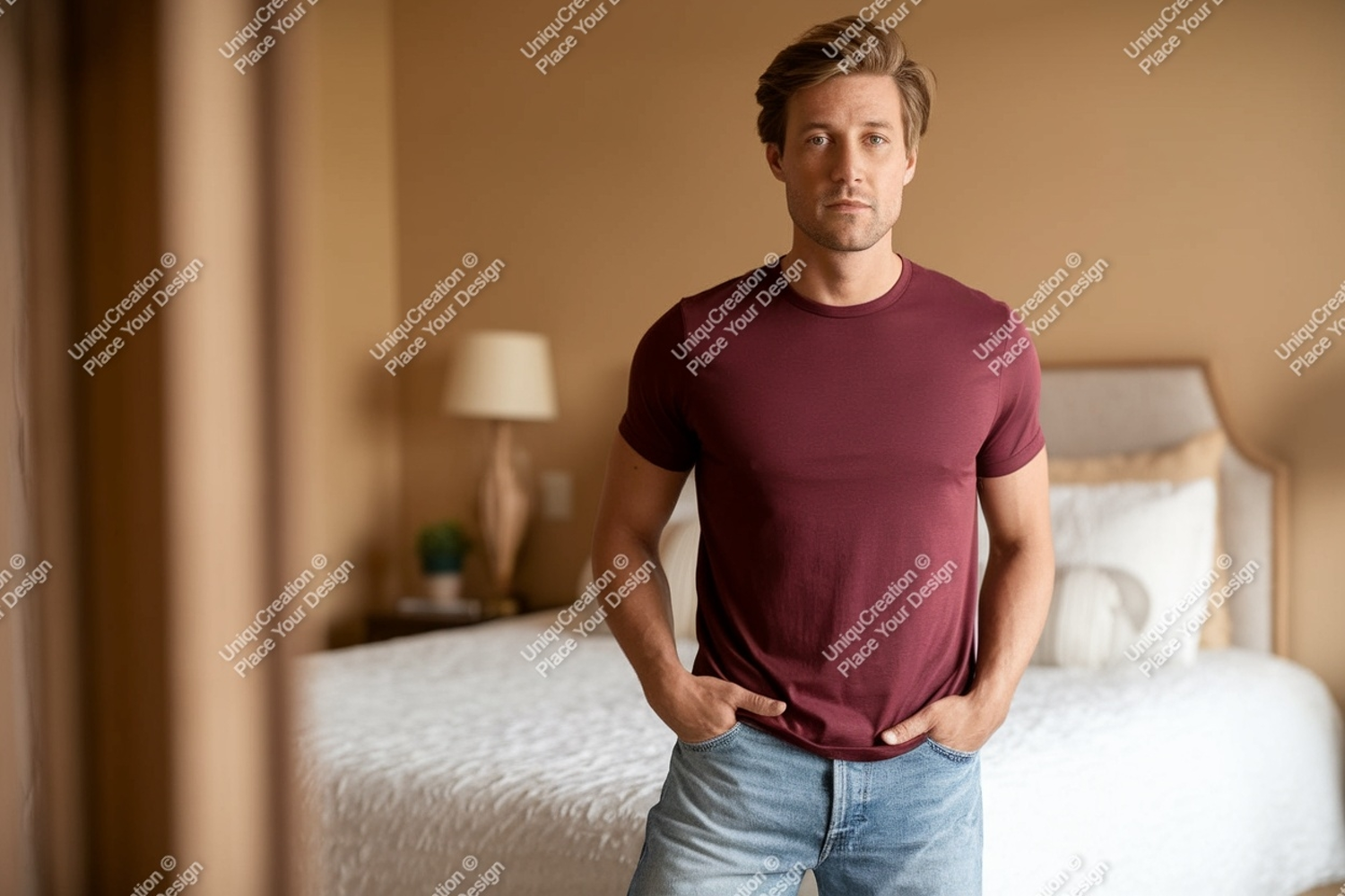 Similar Design Products to Man wearing maroon t shirt and jeans image