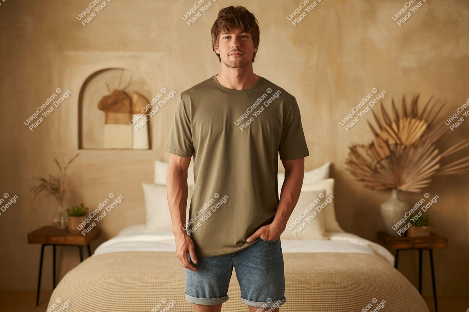 Similar Design Products to Man wearing olive t shirt and denim shorts image