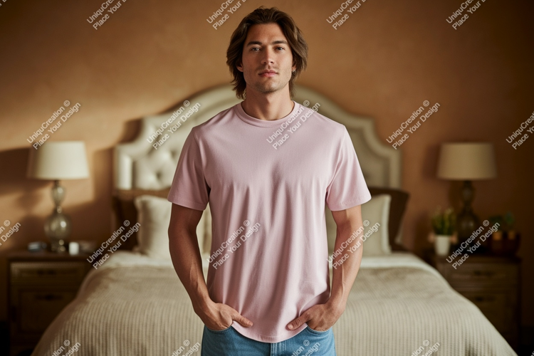 Fashion Man T-shirt Pink Clothing Casual Mockup Apparel Indoor Bedroom