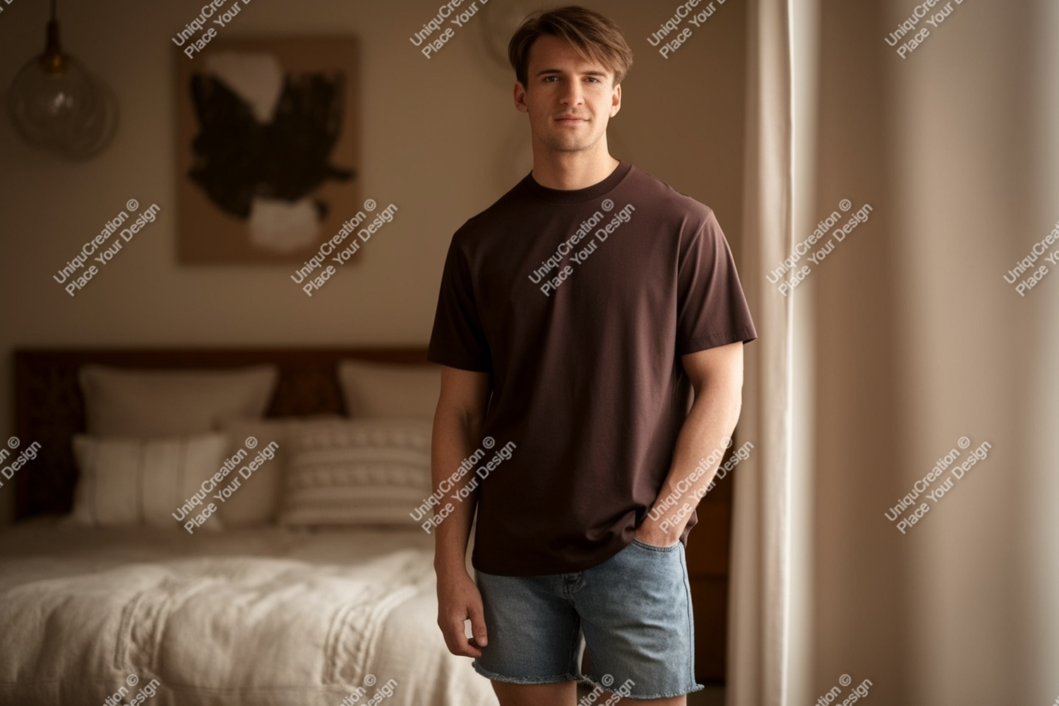 Man T-shirt Casual Mockup Portrait Standing Denim Indoor Bedroom Shorts