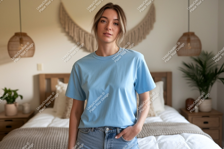 T-shirt Casual Interior Mockup Woman Blue Jeans Denim Relaxed Bedroom