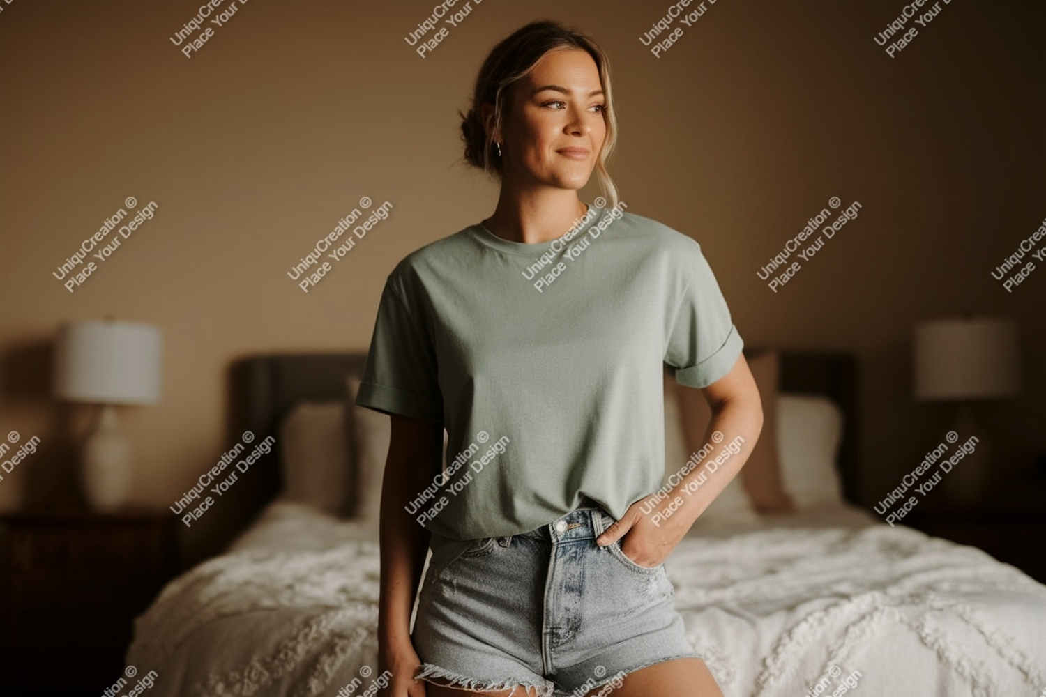 Shirt Casual Green Mockup Woman Denim T Indoor Bedroom Shorts