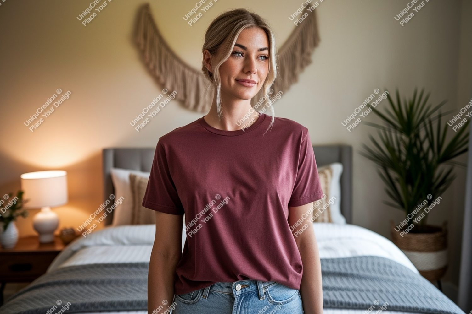 Shirt Casual Interior Mockup Woman Jeans Denim T Maroon Bedroom