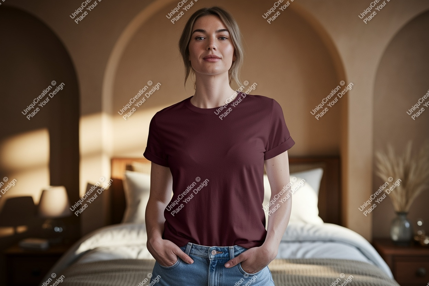 Shirt Casual Mockup Woman Denim T Maroon Bedroom Shorts Indoors