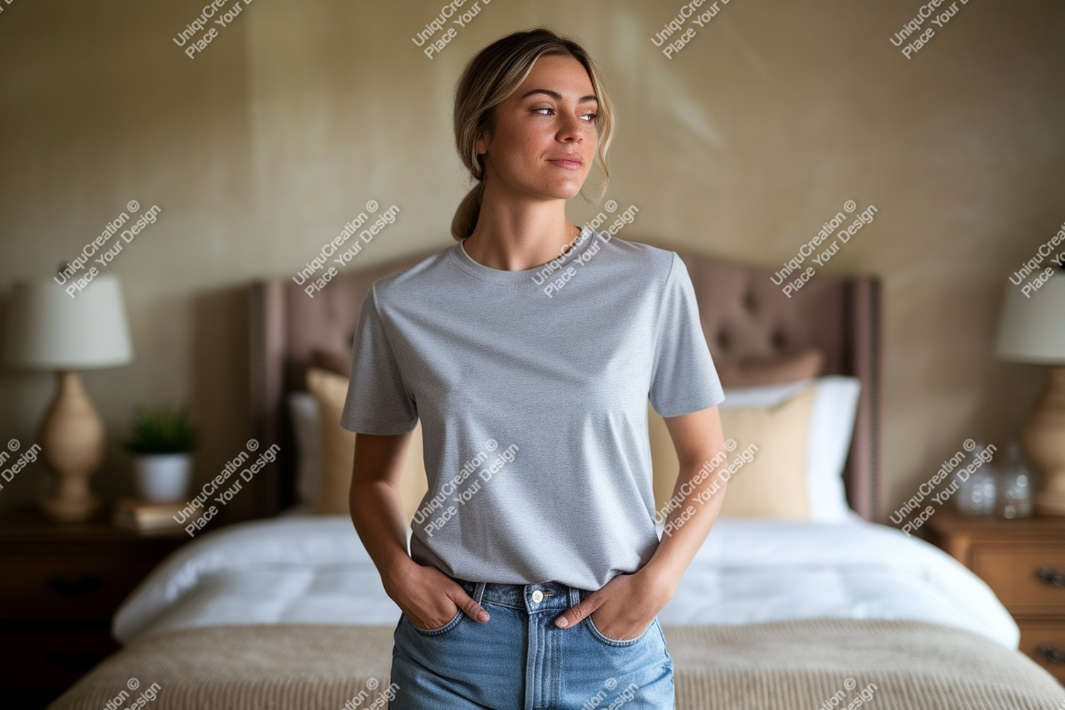 Fashion T-shirt Casual Mockup Woman Jeans Grey Denim Indoor Bedroom