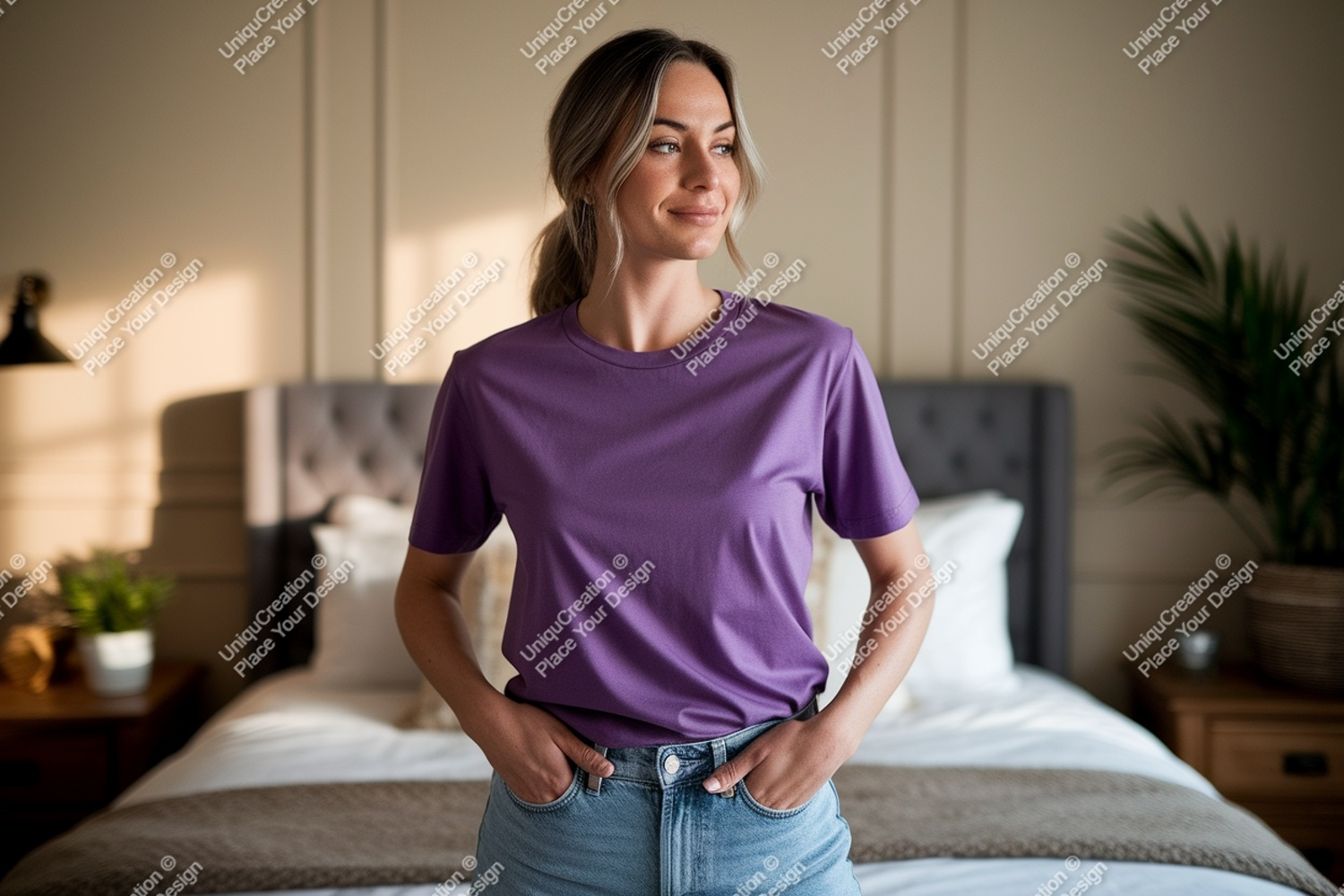 Shirt Casual Mockup Woman Purple Jeans T Indoor Relaxed Bedroom