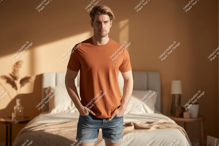 Fashion Man Shirt Clothing Casual Mockup Orange Denim T Shorts
