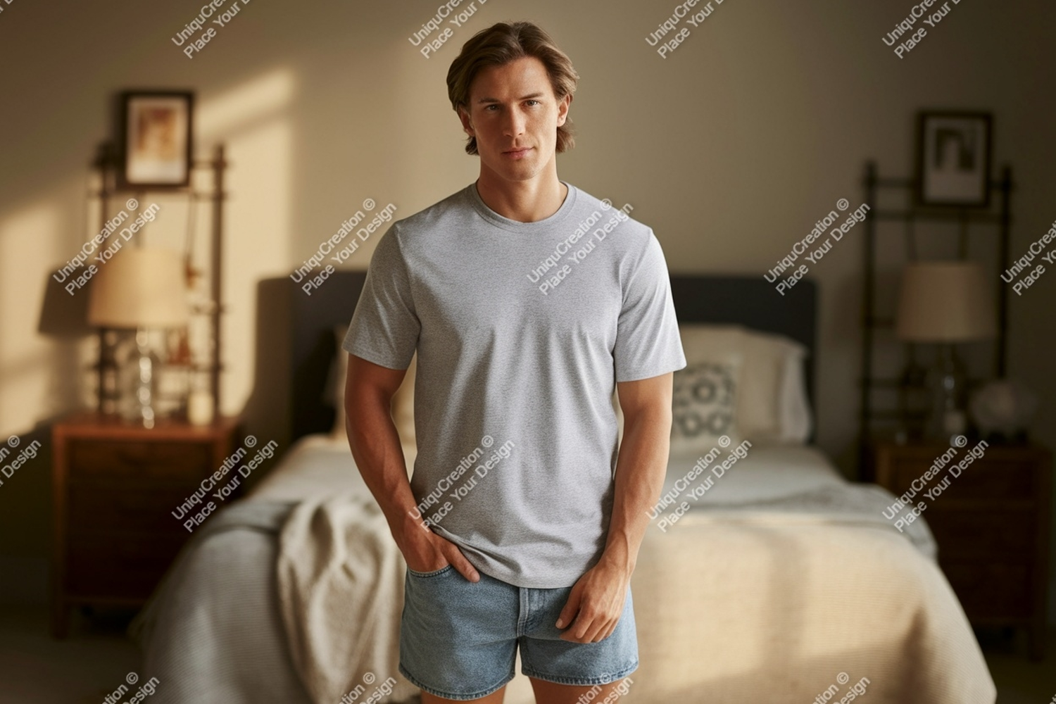 Man Shirt Mockup Grey Bed Denim Lamp T Bedroom Shorts