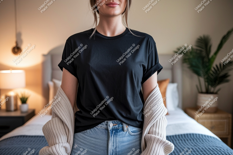 Black Shirt Mockup Woman Jeans T Knit Cozy Bedroom Cardigan