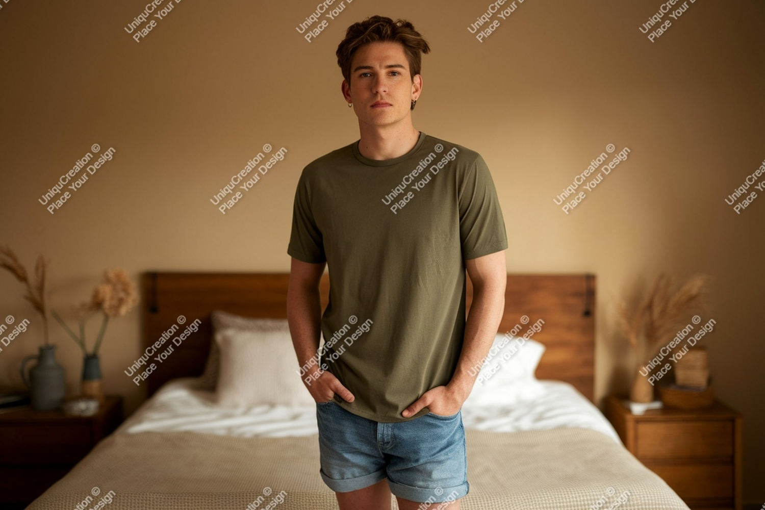 Similar Design Products to Young man wearing olive t shirt and denim shorts male