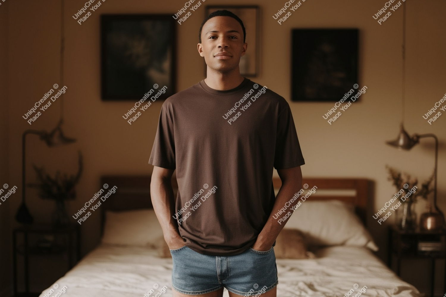 Similar Design Products to Man wearing brown t shirt denim shorts indoors image