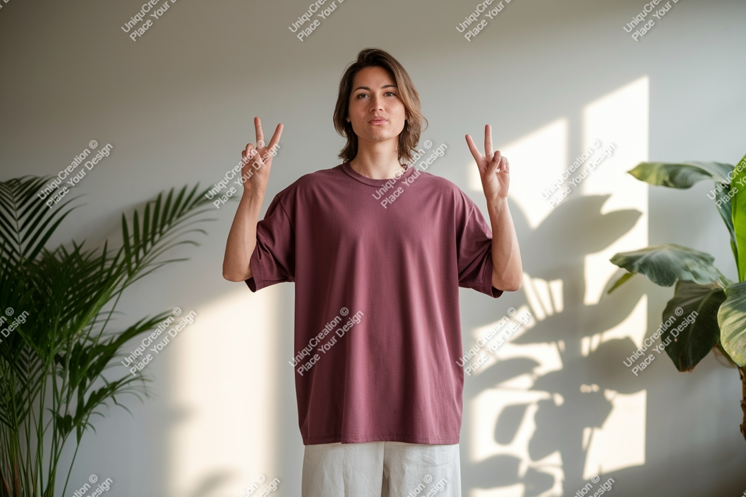 Similar Design Products to Man wearing maroon t shirt peace sign image