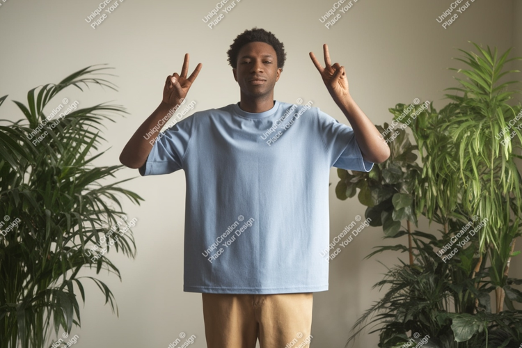 Light Man Shirt Casual Mockup Peace Blue Plants Indoor Gesture
