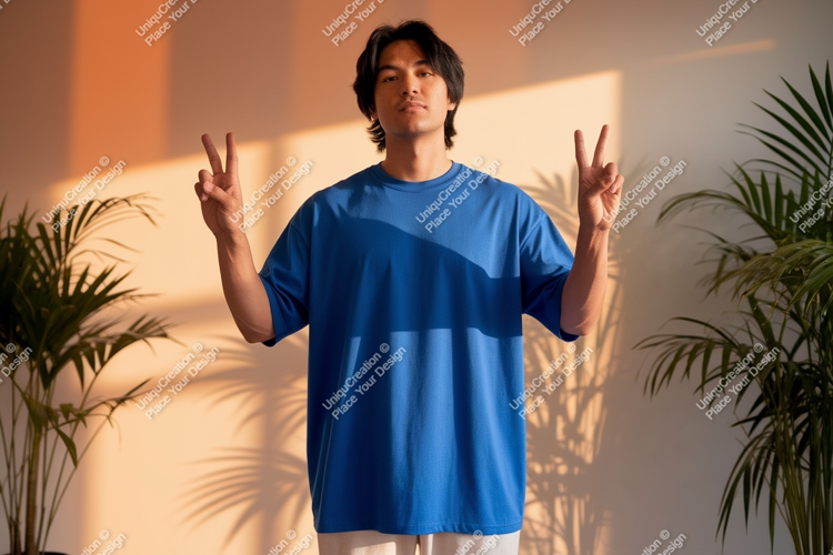 Light Man Shirt Casual Mockup Peace Blue Plants Shadows Gesture