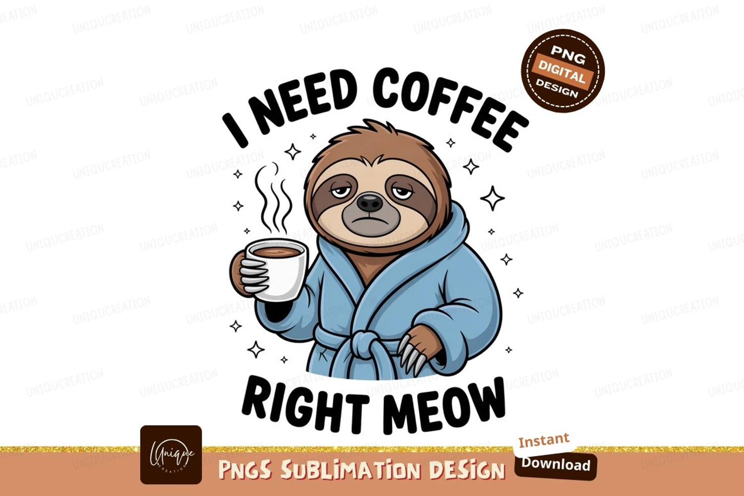 Sleepy sloth in robe holding coffee cup animal mammal example image 1
