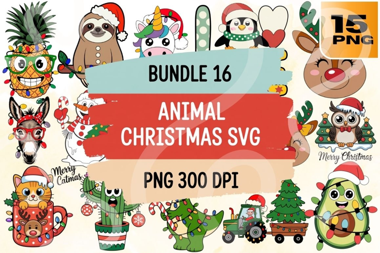 Celebrate the holidays with the Animal Christmas SVG Bundle, featuring 15 adorable, high-quality PNG designs at 300 DPI. This collection includes festive animals wearing Santa hats, reindeer antlers, and surrounded by Christmas lights and decorations. From a cactus with ornaments to a sloth, penguin, and owl, these fun and cheerful designs are perfect for creating custom Christmas gifts, t-shirts, mugs, cards, and more. Spread joy this holiday season with these cute animal designs!