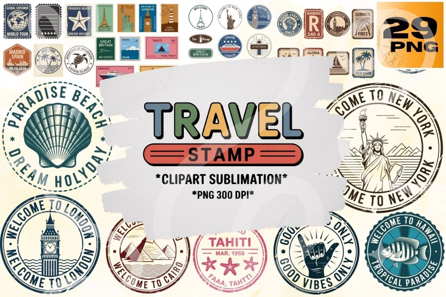 ✈️ Stamp your way around the world—no passport required. This Travel Stamp Clipart Sublimation Bundle includes 29 high-resolution PNGs (300 DPI), each designed to evoke the spirit of exploration. With retro-style stamps featuring iconic destinations like New York, London, Cairo, and Tahiti, this bundle is perfect for creators who want to add a touch of wanderlust to their designs.