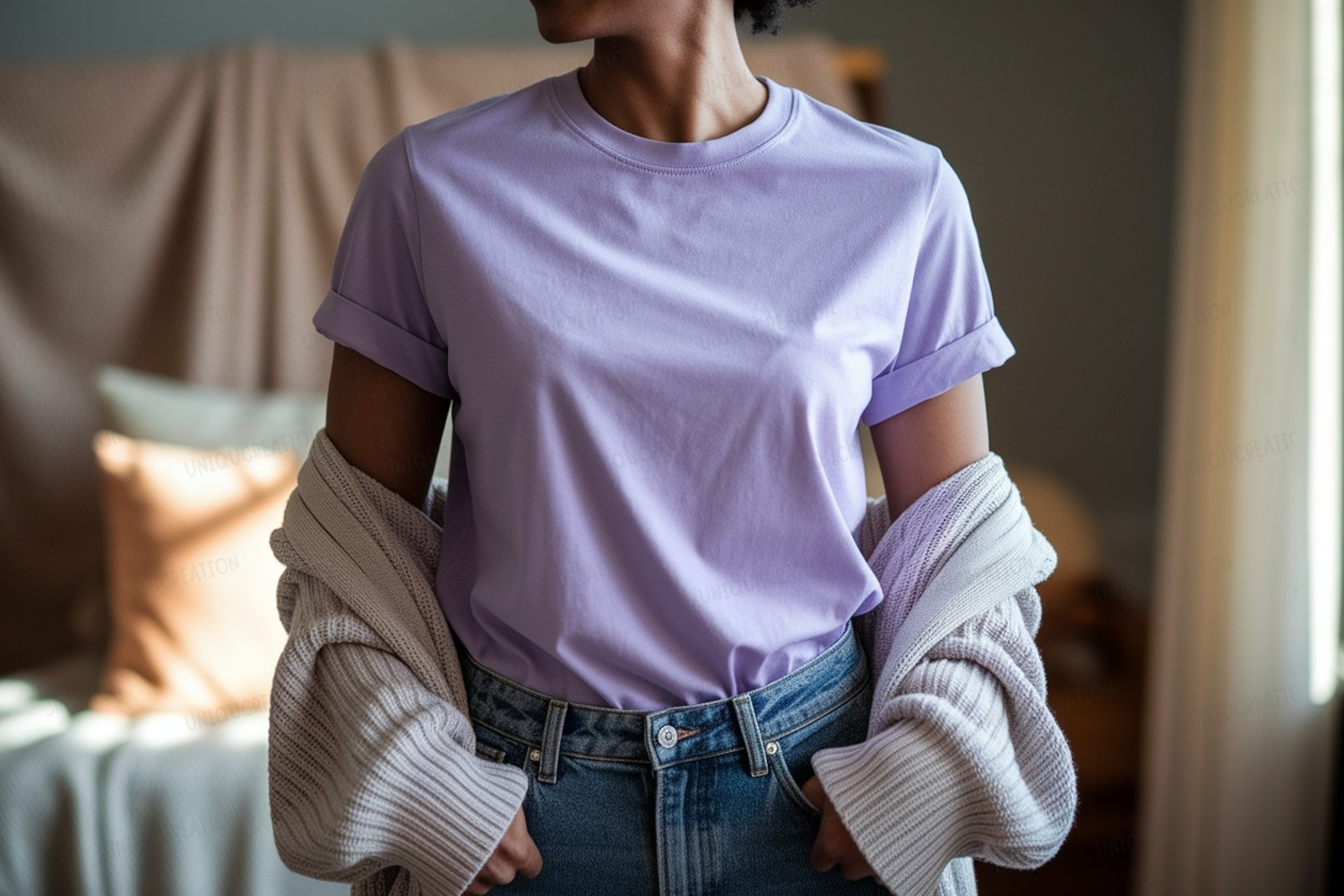 woman, lavender, t, shirt, denim, jeans, cardigan, casual, fashion, clothing, mockup, style, comfort, indoors, portrait, apparel, outfit, garment, textile, fabric, wear, attire, ensemble, threads