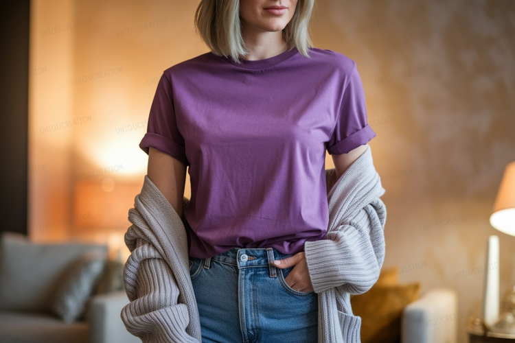 mockup, apparel, clothing, fashion, casual, female, person, shirt, purple, jeans, denim, blue, cardigan, knit, sweater, cozy, comfortable, indoor, home, lifestyle, style, outfit, wear, garment, textile, fabric, cotton, soft, warm, stylish, trendy, modern, simple, elegant, chic, relaxed, feminine, portrait, studio, light, everyday