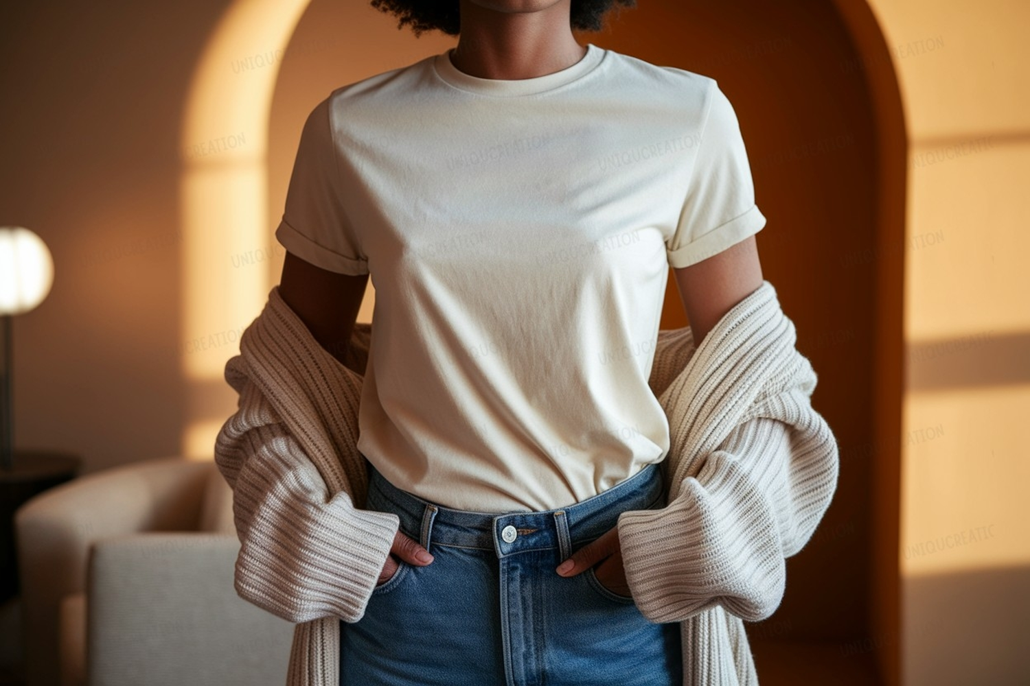 Cream tee blue jeans cardigan mockup image