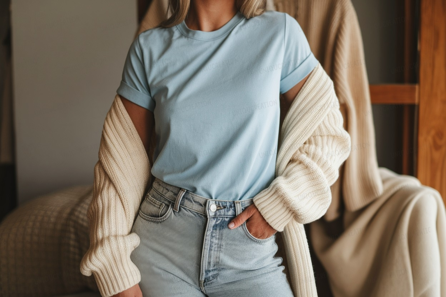 Similar Design Products to Light blue t shirt and cream cardigan mockup image