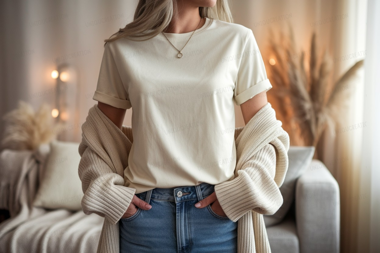 Cream tee and cardigan mockup woman