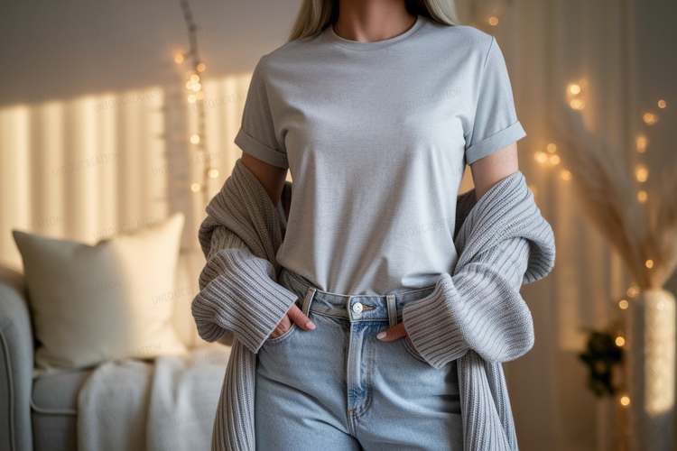 Fashion Tshirt Clothing Casual Mockup Scene Female Grey Indoor Cozy