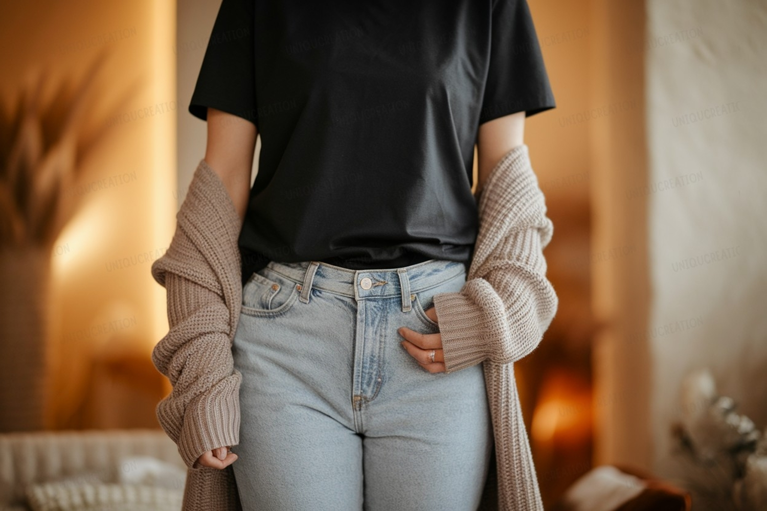 Light Fashion Black Shirt Clothing Casual Mockup Jeans Beige Cardigan