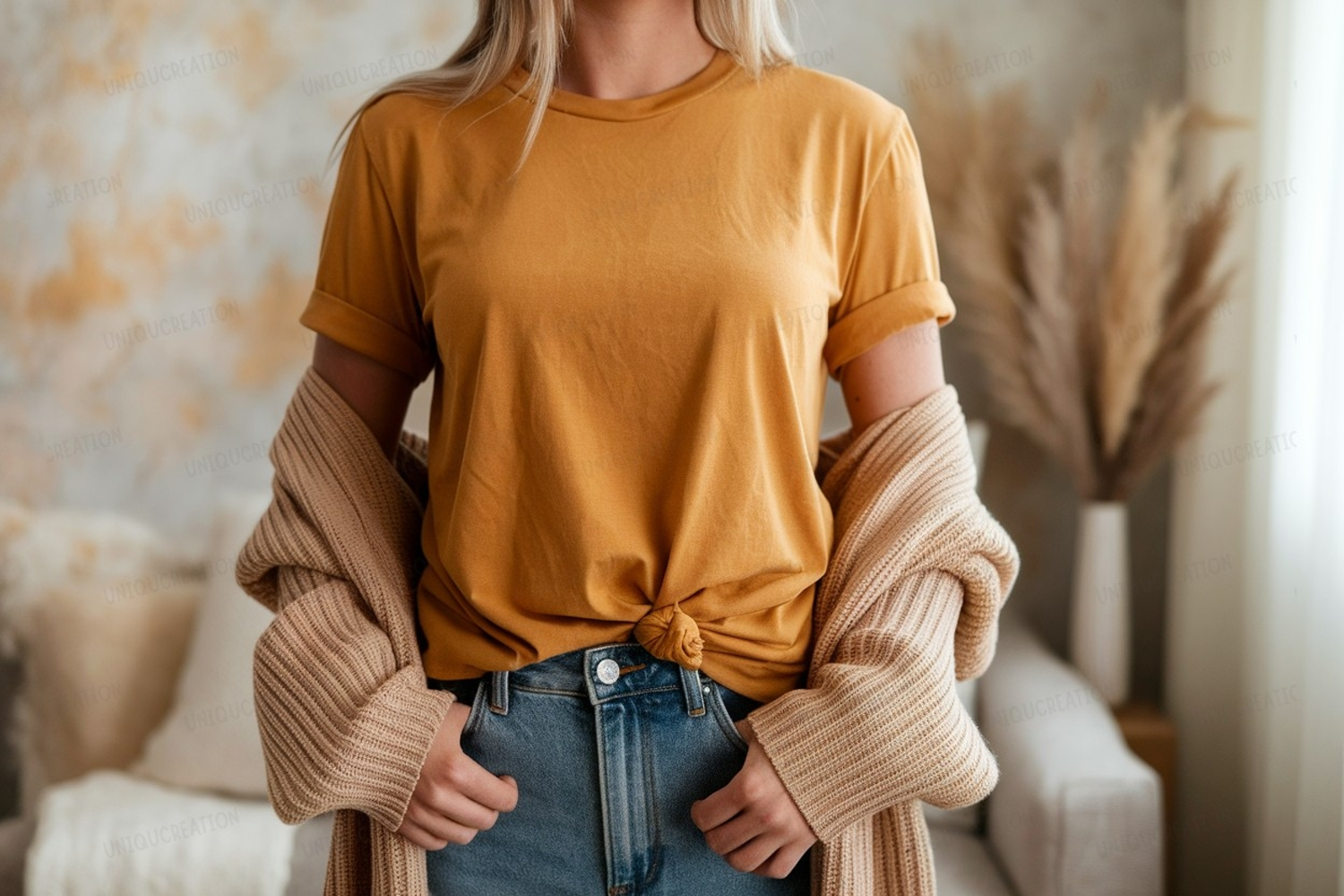 Fashion Shirt Clothing Casual Mockup Apparel Jeans Denim T Mustard