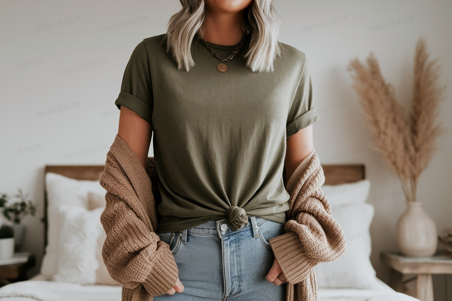 Similar Design Products to Olive tee and tan cardigan mockup image
