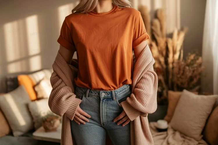 Orange shirt blue jeans cardigan mockup image example image 1
