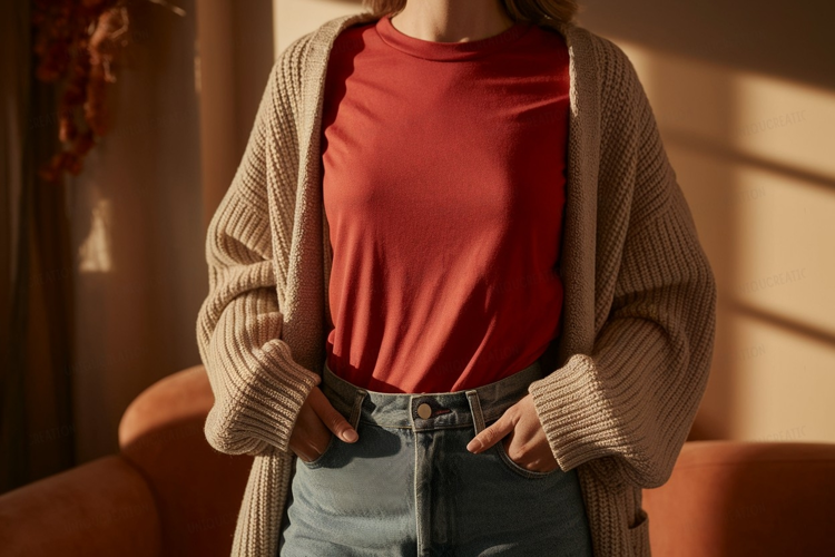 Similar Design Products to Woman wearing red shirt and beige cardigan image