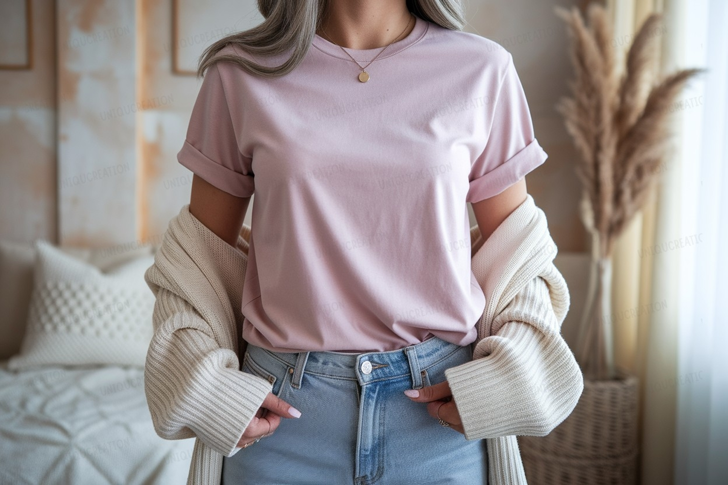 Pink shirt light jeans cream cardigan mockup apparel example image 1