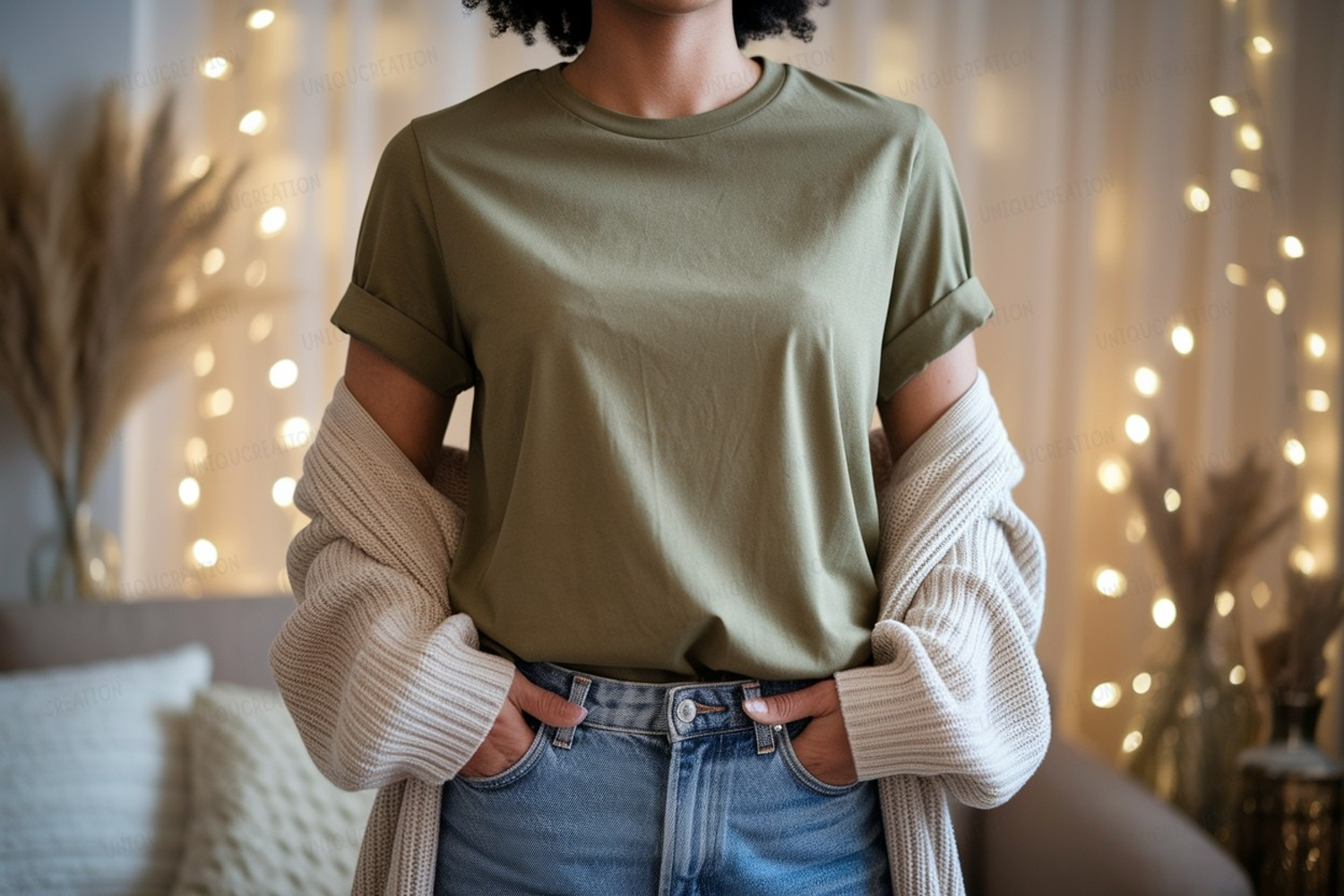 Olive green t shirt mockup with cozy cardigan image example image 1