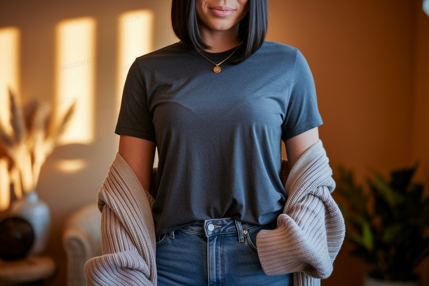 Similar Design Products to Woman wearing dark grey t shirt and denim jeans image