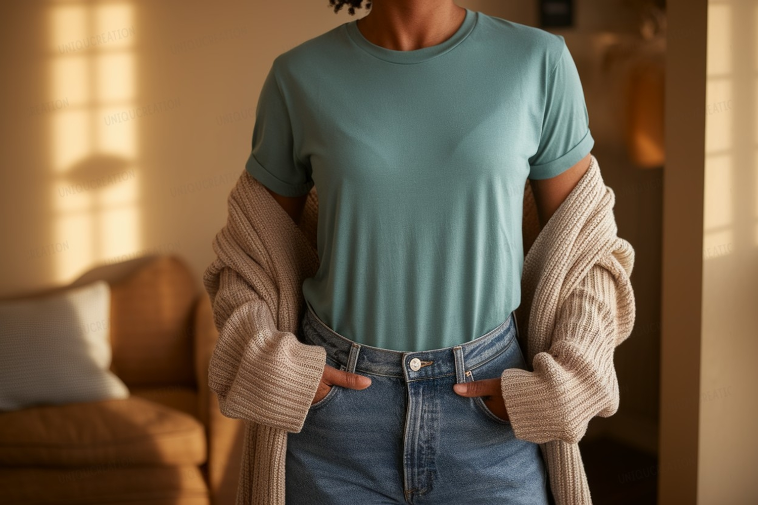 Similar Design Products to Teal t shirt and denim jeans mockup image
